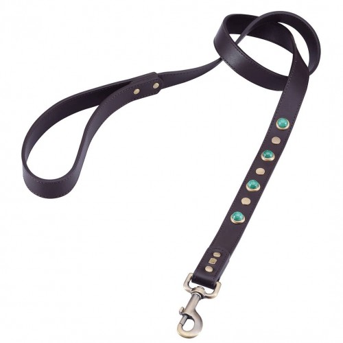 Your pooch will ooze sophistication in this genuine brown leather dog collar with vintage handmade glass malachite cabochons and round brass studs. The hand carved gemstones are secured onto the leather with with brass rivets. Matching leashes available and sold separately. Materials: Genuine leather, malachite, brass