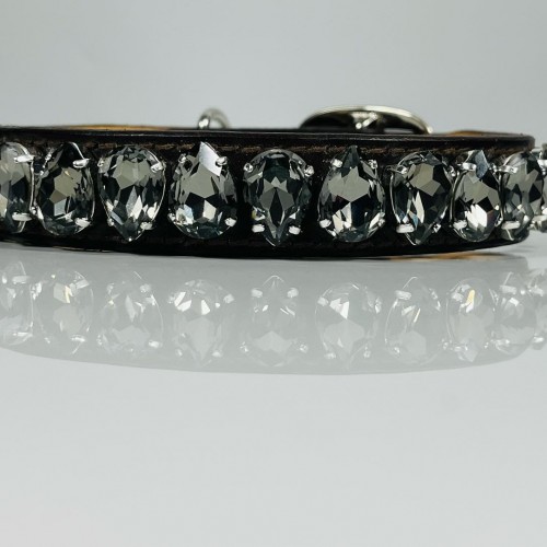 Explore our exquisite liz dog collar, featuring dazzling fancy stones in a sleek black diamond color! We meticulously handcraft each collar from durable full grain leather and embellish them with high-quality stones measuring 18x13mm, adding a touch of luxury to your pet’s style.