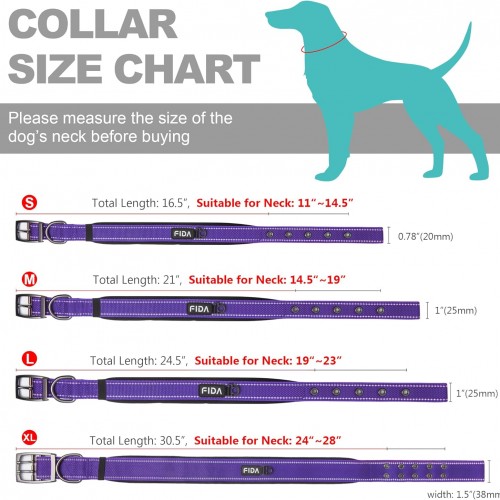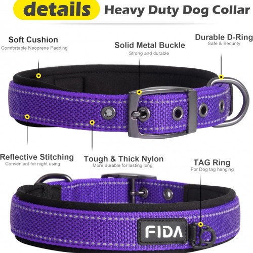 Fida Heavy Duty Dog Collar, Ultra Comfortable Soft Neoprene Padded, Adjustable Reflective Nylon Pet Collar with Durable Metal Belt Buckle for Large Breeds (L, Purple)