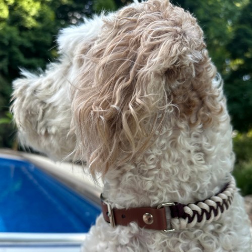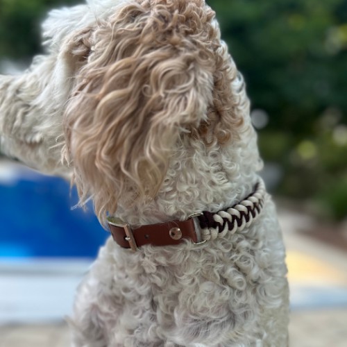 This Fishtail Hand Braided Dog Collar is woven in burgundy and cream, with a medium brown buckle and nickel plated silver hardware.