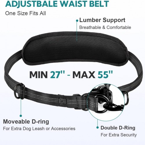 - Comfortable Dog Leash Waist Belt: Dog waist leash belt with a foam pad enables you to reduce stress on your body! Adjustable waist belt range of 27 to 55 inches fits a large range of waist sizes. This waist dog leash passes through the support part of the waist, make sure you won’t be dragged down by the dog walking belt which keeps you safe walking dogs! The hand free dog leash has two metal hooks to keep your dogs connected to you, so you can freely enjoy running & walking with your dogs.
