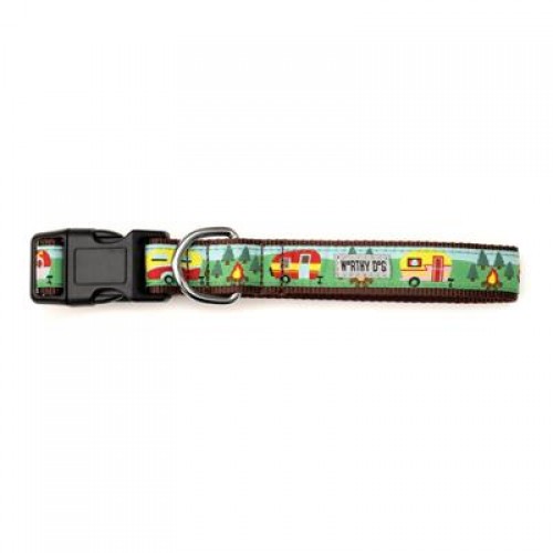 Adjustable collars focused on durability and style, featuring woven ribbon sewn onto comfortable and strong nylon webbing with snap clasp and nickel-plated hardware.