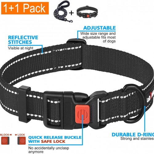 Heavy Duty Dog Leash – Comfortable Padded Handle, 5 ft Long – Dog Leashes for Small Medium Large Dogs (Leash+Collar L Neck 20″-25″, Black)