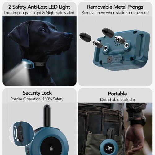 - 【Reliable and IPX8 Waterproof】The electric dog collar can be used in any weather and any condition thanks to the IPX8 waterproof design of the receiver. Includes a built-in LED collar light for the e-collar that helps locate your dog during night walks. Featuring a safety lock and switch button, it ensures quick response, preventing accidental activation and ensuring consistent training.