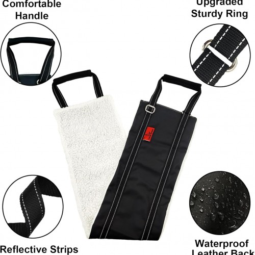 - Easy to use and store: place the harness under the dog’s belly with the fleece lining touching their belly, and adjust the webbing as needed. It can be easily folded for portability when not in use.