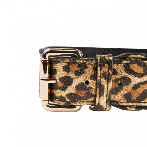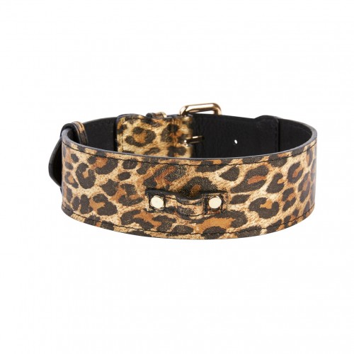 Leopard Print Italian Leather Collar With Gold Classic Hardware
