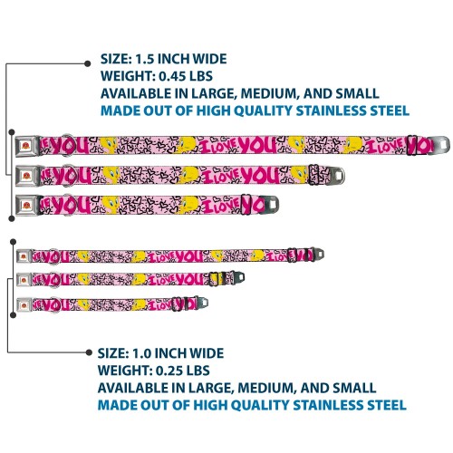 Looney Tunes Logo Full Color White Seatbelt Buckle Collar – Tweety Bird I LOVE YOU Pink/Black