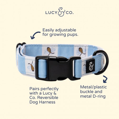 Who says everyday essentials should be boring? Not us! Our collars look good and feel great too: made from polyester webbing with some thoughtful hardware upgrades, this collar is durable and easy to care for, and it’s the perfect match with our Bumbling Around Walk set and matching apparel.