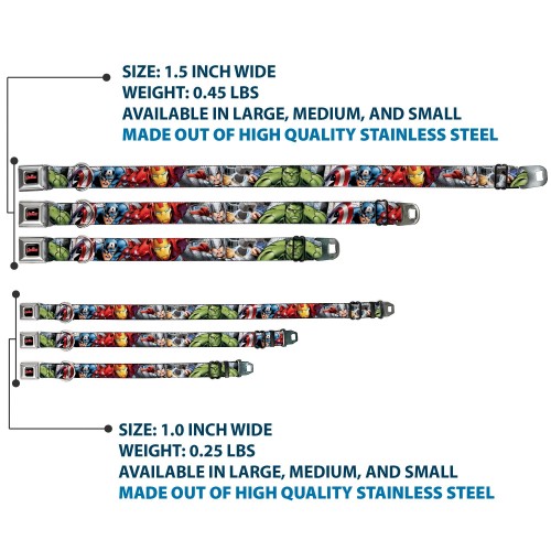 MARVEL AVENGERS Logo Full Color Black/Red/White Seatbelt Buckle Collar – Marvel Avengers 4-Superhero Poses CLOSE-UP
