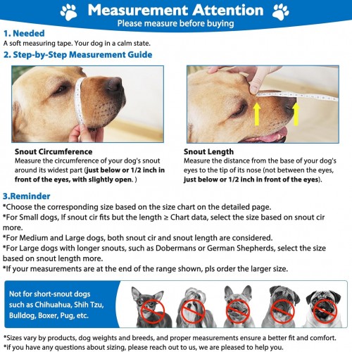 - Dog Muzzle for LARGE Dogs (Cir: 10½”-11¾”, Length: 4”): Muzzle for large sized dog fits for Belgian Malinois, Akita, Labrador, Golden Retriever, etc. but not for highly anxious dogs and flat-faced dogs like Pug. Please refer to the pictures or videos to measure the snout cir and length before buying the dog muzzle large breed.