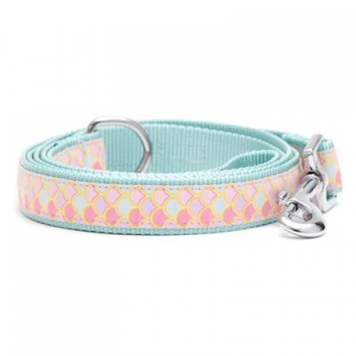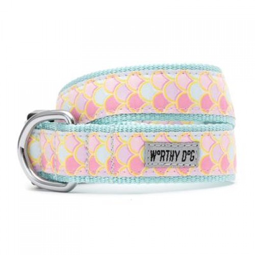 The Worthy Dog Mermaid Dog Collar & Leash Collection is an adjustable collar focused on durability and style. The collar features a woven ribbon sewn onto comfortable and strong nylon webbing with a snap clasp and nickel-plated hardware and D-ring.