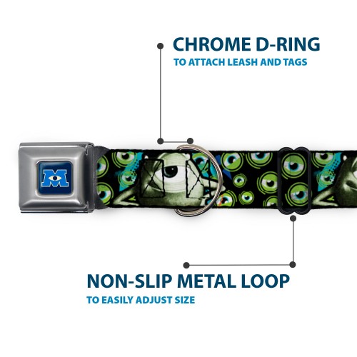 Monsters University Logo Full Color Blue White Seatbelt Buckle Collar – Mike Poses/Eyeballs Black/Greens