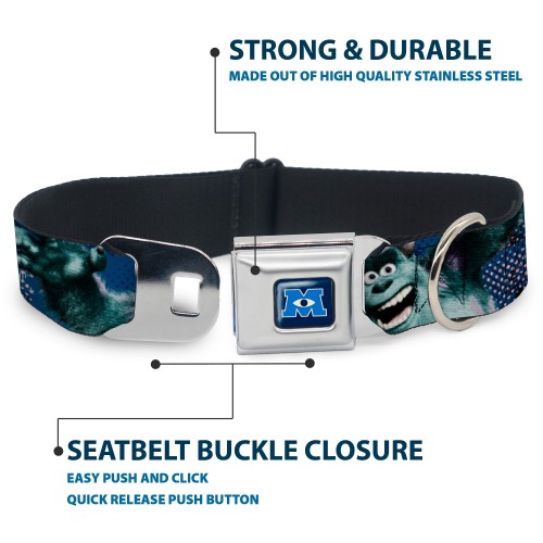 Monsters University Logo Full Color Blue White Seatbelt Buckle Collar – Sulley Scare Pose/Dots Blues/White