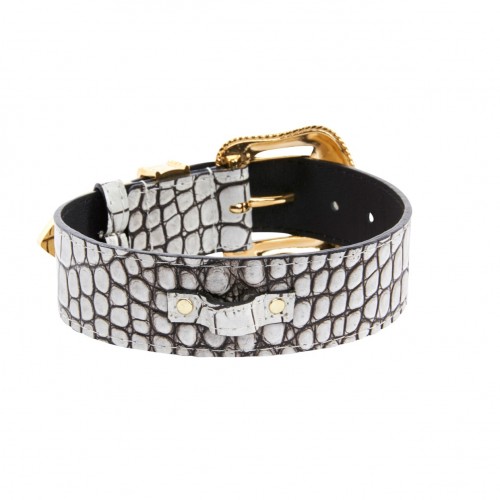 Dark Brown/Off White Embossed Croc Italian Leather Collar With Gold Swarovski Hardware