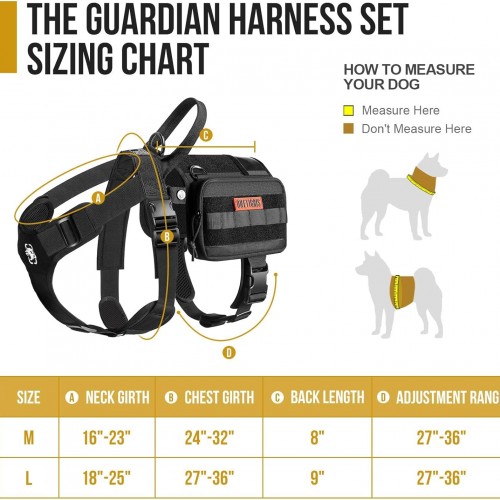 - Comes with an ergonomic strapped harness, saddled canine EDC pouches, with leash clips, MOLLE compatibility, patch panels, clear ID window, and service dog handle attachment D-rings.