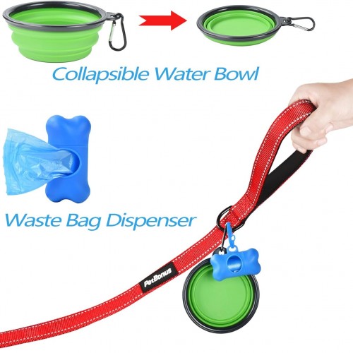PetBonus Double Dog Leash, No Tangle Dual Leash, Reflective Walking Training Lead, 4 Comfortable Padded Handles for 2 Dogs with Collapsible Bowl and Waste Bags (Red, Large)