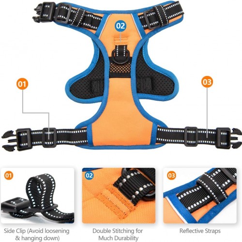- [UPDATED VESION, EASY TO PUT ON & TAKE OFF] This dog harness has 3 snap buckles( One is on the neck, two are on the chest), NO NEED go through dog’s head. This will let your dog loves to wear harness!