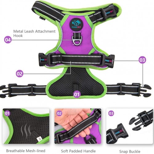 - [UPDATED VESION, EASY TO PUT ON & TAKE OFF] This dog harness has 3 snap buckles( One is on the neck, two are on the chest), NO NEED go through dog’s head. This will let your dog loves to wear harness!