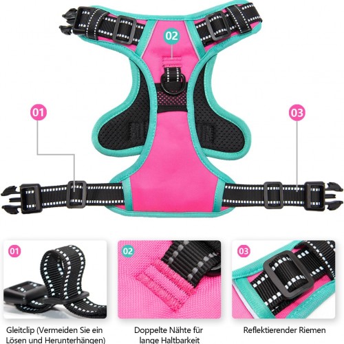 - [UPDATED VESION, EASY TO PUT ON & TAKE OFF] This dog harness has 3 snap buckles( One is on the neck, two are on the chest), NO NEED go through dog’s head. This will let your dog loves to wear harness!