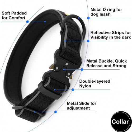 - Secure Fit. Equipped with quick-release metal buckle and sturdy metal adjuster, our thick collar ensures a secure and customizable fit for your dog, giving you peace of mind during outdoor activities.