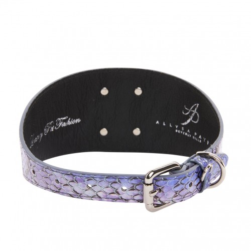 A stunning Luxury Pet Fashion 3 Wide Style Collar. Made from custom iridescent colored Purple/Silver/Black Snake. Complete with our large custom Silver Rivet. Fit 14-19 neck.