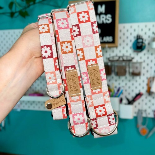 These collars are flat side-release buckle collars that are handmade to order. They have Nylon or Polypropylene Webbing inside of the fabric to ensure that they stay durable and strong.