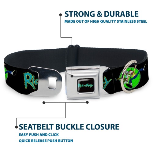RICK AND MORTY Text Logo Full Color Black/Blue Seatbelt Buckle Collar – RICK AND MORTY Title Logo and Portal Pose Black