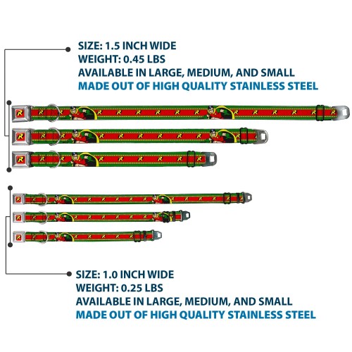 Robin “R” Logo Full Color Red/Black/Yellow Seatbelt Buckle Collar – Robin Action Pose/”R” Logo Stripe Green/Yellow/Red/Black
