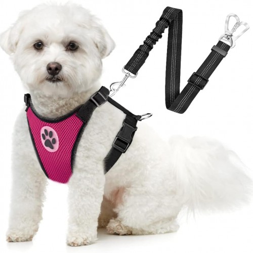 - KEEP YOUR FURRY FRIEND SAFE — Mesh chest vest harness and 2 in 1 dog car seat belt works well together, this holds your pet securely in his place. Reduced puppy barking and anxious in the car, and when he does go off, he cannot get far. But the dogs can still move around, lie down, see out of the windows. This harness and seat belt made the long trip a lot more pleasant for you and your puppy.