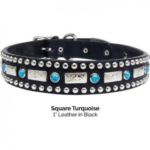 The Woof Wear Square Turquoise is a beautiful dog collar with a southwestern flare. Incorporating turquoise cabochons, engraved steel rectangle ornaments, and shiny nail heads, this collar is one of our best sellers! With a variety of leather colors to choose from, your Square Turquoise collar and leash will be as unique and beautiful as your pup. Make your furry friend the envy of every dog at the park and order your Woof Wear collar and matching leash today.