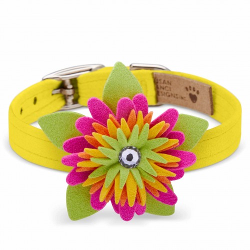 Three Tinkies Garden Flowers bundle together and glisten with centered genuine Swarovski crystals. Comfortable for your dog, easy for you to maintain. Like all of our designs, this 1/2″ collar is made from genuine commercial upholstery grade Ultrasuede® fabric that we import from Japan. This soft, comfortable fabric is breathable, washable and colorfast. This collar is manufactured in the USA. We recommend your dog should always be walked with a harness. Our collars are designed for ID tags, charms and for decoration. They are not designed for pulling dogs.