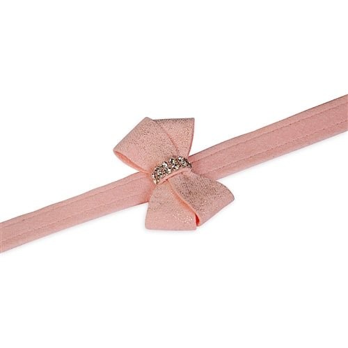 The classy Nouveau Bow has reached another level of beauty in our new Glitzerati collection. Centered with rows of gleaming Swarovski Crystals, this foil like effect is embedded into the Ultrasuede so that none of this glitz will rub off or wash out. Just like our solid Ultrasuede’s, use after use, wash after wash, this timeless fabric will maintain it’s beauty. The 1/2 inch collar base is embellished with 3 rows of genuine Swarovski Crystals taking this collar from fancy to luxurious. The entire collar is made from genuine commercial upholstery grade Ultrasuede® fabric that we import from Japan. This soft, comfortable fabric is breathable, washable and colorfast. This collar is manufactured in the USA. We recommend the dog should always be walked with a harness. Our collars are designed for ID tags, charms and for decoration. They are not designed for pulling dogs.