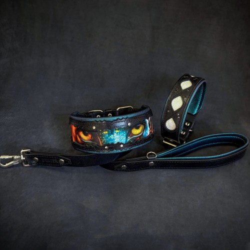 Made from fish-patterned leather that catches the light with every move, this collar shimmers like underwater scales — paired with soft turquoise padding for a look as stunning as it is comfortable. ✨