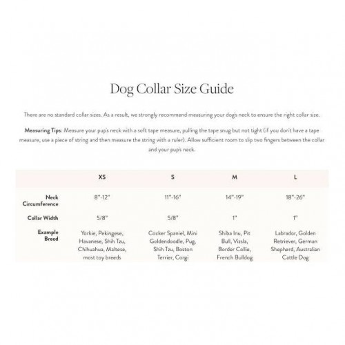 DETAILS -Soft natural fabric on the outside and inside – perfect for sensitive pups with nylon allergies or chafing -Nylon webbing core for strength and durability -Reinforced box stitches at all stress points Please note: we do not recommend salt water exposure for our collar hardware. MATERIALS AND CARE -100% cotton fabric exterior, nylon webbing interior -Hardware: gold zinc alloy with a solid brass D-ring -Hang wash or machine wash on delicate cycle inside a bag or pillowcase to protect the hardware. Air dry flat.