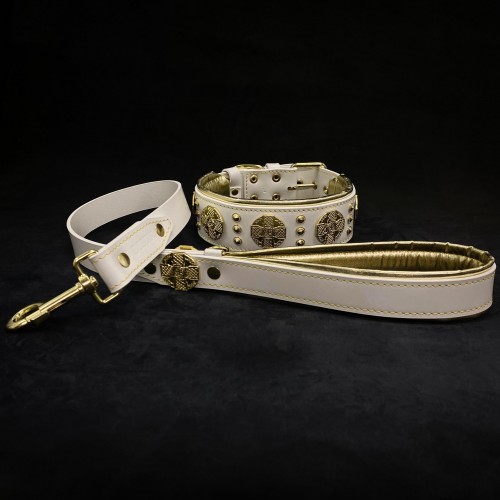This collar has a base layer of 4 mm thick high quality belt leather, which is extremely durable and on the inside it has a soft lamb leather cushion in golden color.