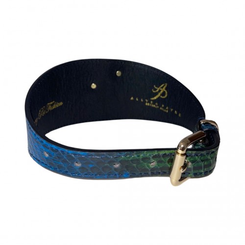 Truly one-of-a-kind! Stunning and unique, Blue, Green, Black Snake 3 Wide Style Collar, with our Green/Rhinestone Poodle Rivet. This collar fits a 14-19 neck size.