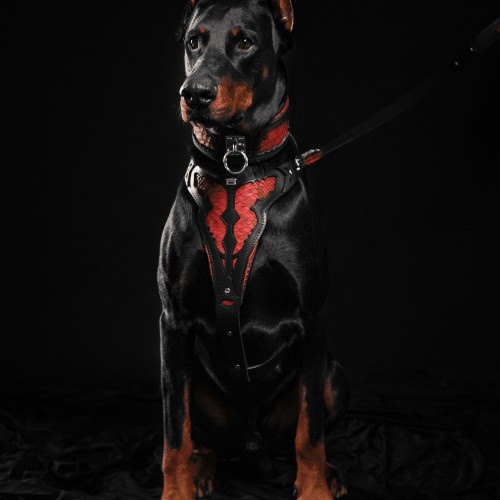 The eye-catching ”Red Dragon” collar is a piece of art, combining the thick black base layer leather with the python pattern leather. They are put together nicely giving the collar exclusive looks.