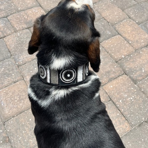 Introducing The Shades of Grey Beaded Dog Collar: featuring a sophisticated design with black, silver, and white beads arranged in an elegant Circle of Life pattern. Set against sleek black leather, this collar combines muted tones and geometric shapes to create a refined and stylish accessory for your dog.