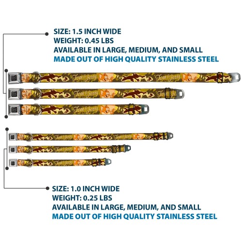 Your dog will be the talk of the town when people notice they’re wearing this awesome SeatBelt Dog Collar! Made from high-density polyester and durable steel components, this collar is built to last. It features beautiful vibrant artwork. The buckle is a miniature authentic SeatBelt Buckle, so you press the center button to release the clasp. This product is Made in USA by Buckle-Down Inc. and officially licensed by Tom and Jerry.