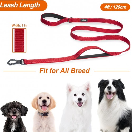- 【SOFT PADDED DUAL HANDLES】4FT length, 1 inch width leash for medium dogs, Comfortable Padded handles protect your hand without rope burn. Extra Handle for traffic control. Red dog leash is perfect for outdoor activities, running, walking or training.