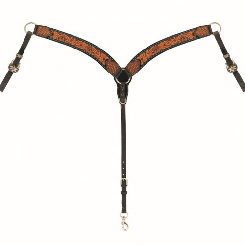 The Beaded Collection is crafted from rich chestnut colored leather, delivering a rugged and refined look. Each piece features durable SS hardware for dependable performance. The vibrant multi color beaded inlays add a lively and decorative touch, while the intricate basket weave tooling offers additional texture and detail. This collection combines durability with unique style, making it a standout choice for those who appreciate both functionality and distinctive design in their tack.