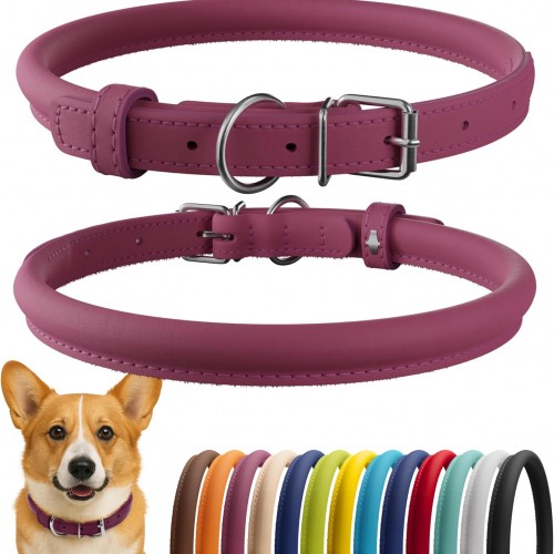 CollarDirect Rolled Leather Dog Collar, Soft Padded Round Puppy Collar, Handmade Genuine Leather Collar Dog Small Large Cat Collars 13 Colors (11-14 Inch, Purple Smooth)