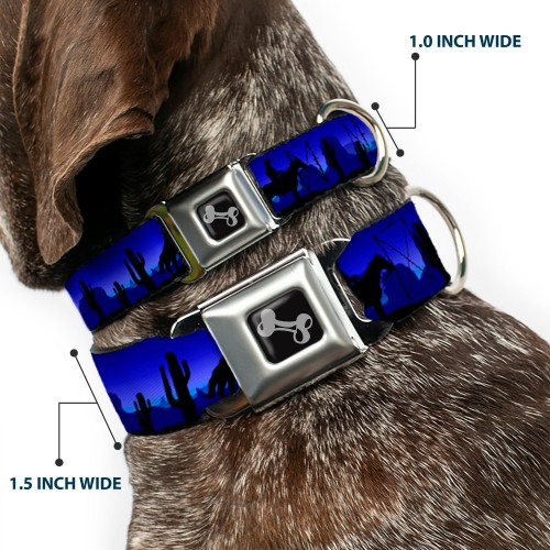 Dog Bone Seatbelt Buckle Collar – Cowboy/Coyote Silhouettes/Western Landscape Blues/Black