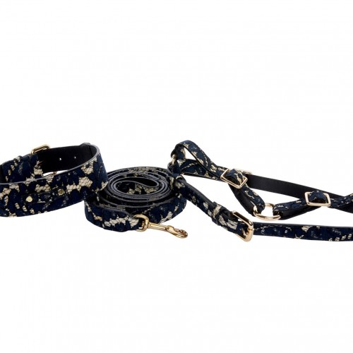 Dark Navy Lace On Gold Italian Leather Classic Collar, Leash & Harness Set