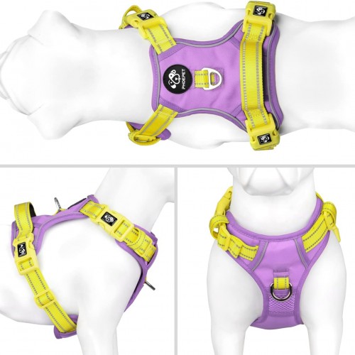 PHOEPET No Pull Dog Harness, Unique Colors Reflective Adjustable Dog Vest, with Soft Training Handle Metal Clips for Small Medium Large Dogs (Baby Purple Base & Yellow Straps,S)