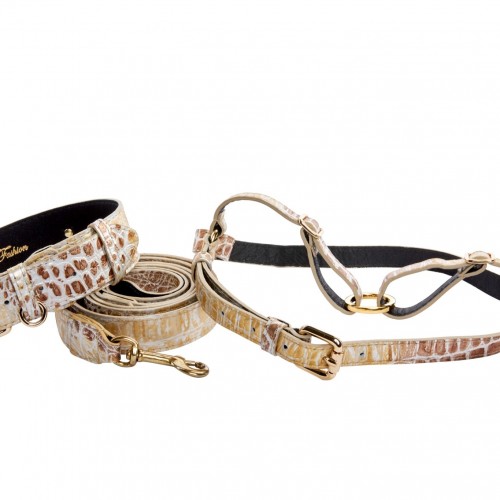 Silver/Bronze/Gold Italian Leather Embossed Croc Classic Collar, Leash & Harness Set
